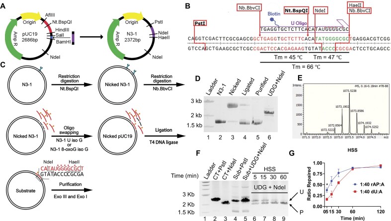 Figure 3. The isotopic labeling plasmid approach to determine BER patch size. (A) The target DNA fragment for “oligo swapping” was inserted into the multicloning site of pUC19, and one of the Nt.BspQI sites was deleted. (B) The DNA sequence flanking the target site, indicating the cut sites of key restriction enzymes. The incoming biotin-labeled synthetic oligonucleotide is shown above the target sequence; the *G indicates isotopically labeled dGMP residues (fully substituted with 13C and 15N). The segment highlighted in green is used for mass spectrometry analysis. (C) Overview of the oligo swapping procedure (see the “Materials and methods” section for details). (D) Stepwise products from the substrate synthesis procedure in panel (C) were loaded on an ethidium bromide-containing agarose gel (lanes 2–5) and subjected to electrophoresis. A DNA ladder was loaded in lane 1. To determine the oligo swapping efficiency, the plasmid substrate was digested with UDG and NdeI (lane 6): removal of U prevents cleavage by NdeI. (E) Mass spectrometry analysis confirming the target fragment released from plasmid substrate by NdeI and HaeII. (F) A sample ethidium bromide-containing agarose gel image showing the repair product of plasmid substrate by Xenopus HSS at the indicated time points, with the repaired substrate susceptible to UDG and NdeI cleavage (lanes 6–9). A DNA ladder was loaded in lane 1. Native pUC19 was digested with PstI (lane 2) or NdeI (lane 3) for size markers. Plasmid substrate was digested with PstI (lane 4) or UDG + NdeI (lane 5) to confirm the presence of uracil. P, repaired product; U, unrepaired substrate. (G) Repair rates for U:A and rAP:A substrates incubated with Xenopus HSS. Gel images were quantified using ImageJ. * P < .05. n = 3 biological replicates and the data are means ± SD. |