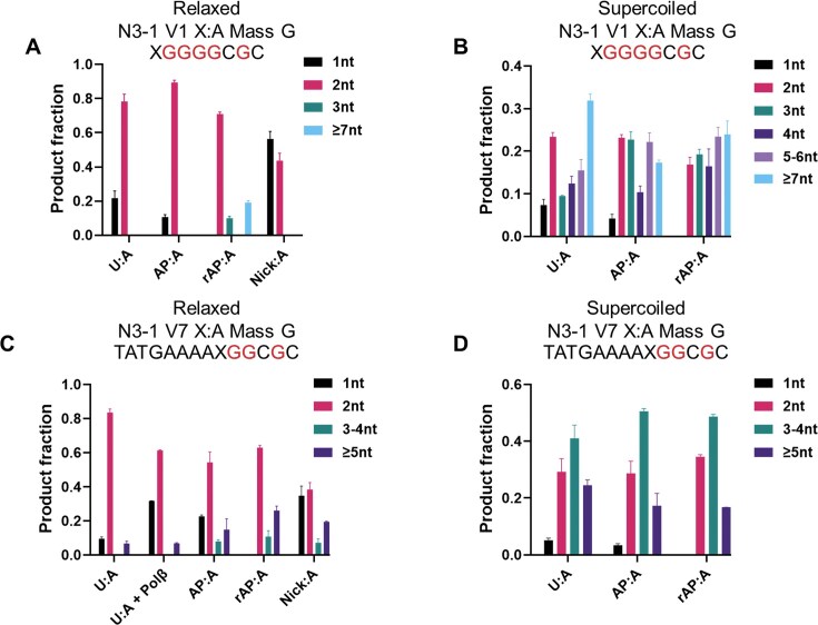 Figure 5. Effect of downstream sequence and topological state on BER patch size. Various lesions in (A) relaxed N3–1 V1 plasmid substrate, (B) supercoiled N3–1 V1 plasmid substrate, (C) relaxed N3–1 V7 plasmid substrate, and (D) supercoiled N3–1 V7 plasmid substrate were tested. Polβ final concentration was 50 nM. n = 3 independent experiments, and the data are means ± SD. |