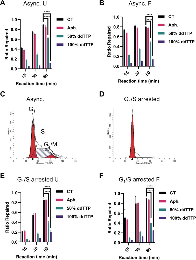 Figure 7. Polβ actively participated in the BER of G1/S synchronized and asynchronous HEK293 FT WCE. The U:A (A) or F:A (B) oligo substrate was incubated with asynchronous HEK293 FT WCE supplemented with aphidicolin (100 μg/ml) or reaction buffers containing 50% or 100% ddTTP for 1 h. The ratio of repaired products was quantified by ImageJ. Cell cycle profiles of asynchronous (C) and double thymidine synchronized (D) HEK293 FT cells. The sensitivity of WCE made from synchronized HEK 293 FT cells to aphidicolin (100 μg/ml) and ddTTP was determined using the U:A (E) or F:A (F) oligo substrate as in panels (A) and (B). n = 3 independent experiments and the data are means ± SD. *** indicates P < .001. **** indicates P < .0001. Aph, aphidicolin. Async, asynchronous. |