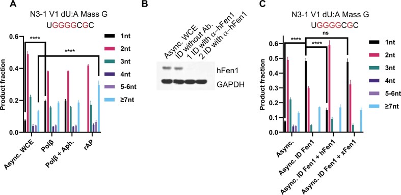 Figure 8. hFen1 immunodepletion increased SP-BER product. (A) The BER patch size for a U:A and rAP:A plasmid substrate generated by asynchronous HEK 293 FT WCE or WCE supplemented with Polβ (50 nM) and aphidicolin (100 μg/ml). Aph, aphidicolin. **** indicates P < .0001. n = 3 independent experiments and the data are means ± SD. Async, asynchronous. (B) The hFen1 abundance in asynchronous HEK 293 FT WCE and anti-hFen1 antibody immunodepleted WCE were determined using western blot. ID: Immunodepletion. (C) The BER patch size for a U:A plasmid substrate generated by asynchronous HEK 293 FT WCE, hFen1 immunodepleted WCE, hFen1 (150 nM) supplemented hFen1 immunodepleted WCE, and xFen1 (150 nM) supplemented hFen1 immunodepleted WCE. **** indicates P < .0001. ns, not significant. n = 3 independent experiments and the data are means ± SD. |