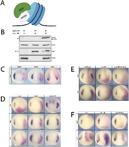 Fig. 4. Myc and Wdr5 interact directly to facilitate neural crest factor expression. (A) Wdr5 and Myc directly interact at chromatin to influence downstream gene expression of Myc target genes. (B) Western blot of Co-IP shows that FLAG-tagged Wdr5 (wdr5-nFT) and Myc-tagged Myc (myc-nMT) directly interact in Xenopus embryos. (C) myc mRNA overexpression inhibits neural crest and NPB gene expression. (D) Co- expression of wdr5 mRNA and myc mRNA facilitates neural crest gene expression. (E) myc expression is required for Wdr5-mediated neural crest expansion. (F) myc mRNA inhibits neural crest and NPB gene expression when wdr5 expression is downregulated. Asterisks indicate the injected side of the embryo. Scale bars: 250[micrometers]. |