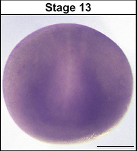 wdr5 (WD repeat domain 5) gene expression in Xenopus laevis embryo, NF stage 6, assayed via in situ hybridization. |