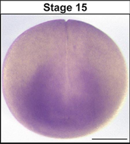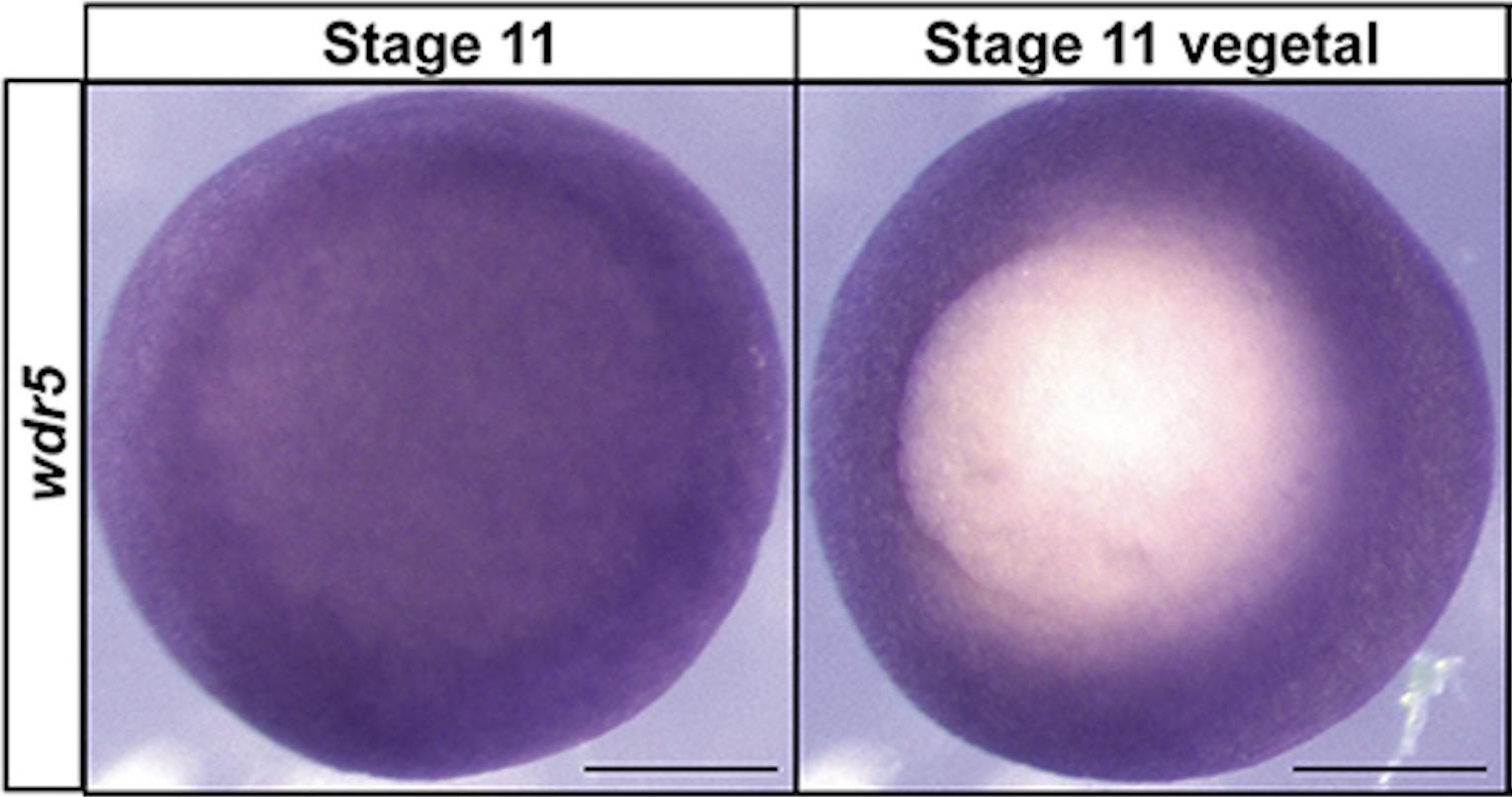 wdr5 (WD repeat domain 5) gene expression in X. laevis embryo, NF stage 11, assayed via in situ hybridization. |