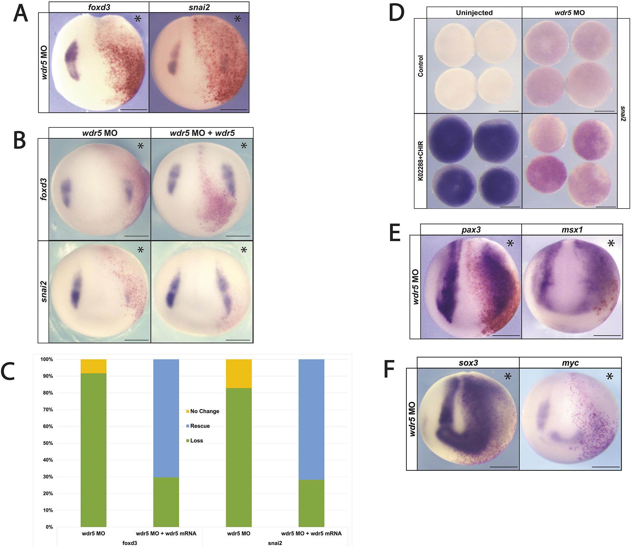 Fig. 2. Morpholino-mediated knockdown shows that wdr5 is required for NC gene expression. (A) Morpholino-mediated depletion of wdr5 inhibits neural crest factor expression. (B) Expression of wdr5 mRNA rescues morpholino-mediated neural crest gene expression. (C) Quantification of rescue percentage for the experiment shown in B. (D) Morpholino-mediated depletion of wdr5 prevents pluripotent blastula cells from being reprogrammed to neural crest state. (E) Morpholino-mediated depletion of wdr5 does not inhibit expression of NPB and neural plate factors. (F) Knockdown of wdr5 leads to an expansion of the neural plate factor sox3 and loss of myc expression at neurula stages. Asterisks indicate the injected side of the embryo. Scale bars: 250[micrometers]. Abbreviations [[MO = morpholino]] |