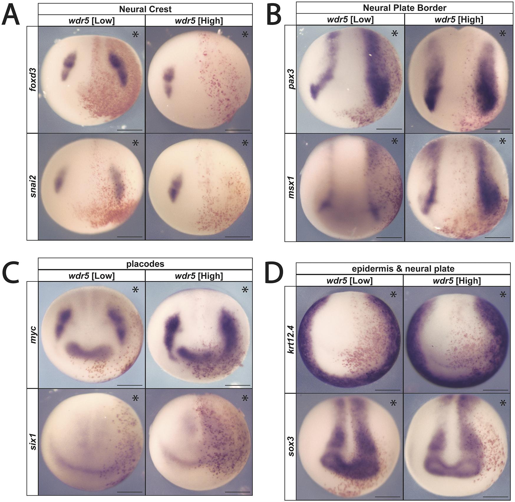 Fig. 3. Overexpression of wdr5 exhibits concentration-dependent effects on neural crest factor expression. (A) Exogenous wdr5 mRNA shows concentration-dependent effects on neural crest gene expression. (B) Increased wdr5 expression expands NPB gene expression independently of mRNA concentration. (C) Exogenous wdr5 mRNA exhibits expanded expression of myc expression and inhibition of six1 expression. (D) Increased wdr5 expression inhibits expression of epidermal keratin factor (krt12.4) and expansion of the neural plate factor sox3 independently of mRNA concentration. Asterisks indicate the injected side of the embryo. Scale bars: 250[micrometers]. |