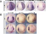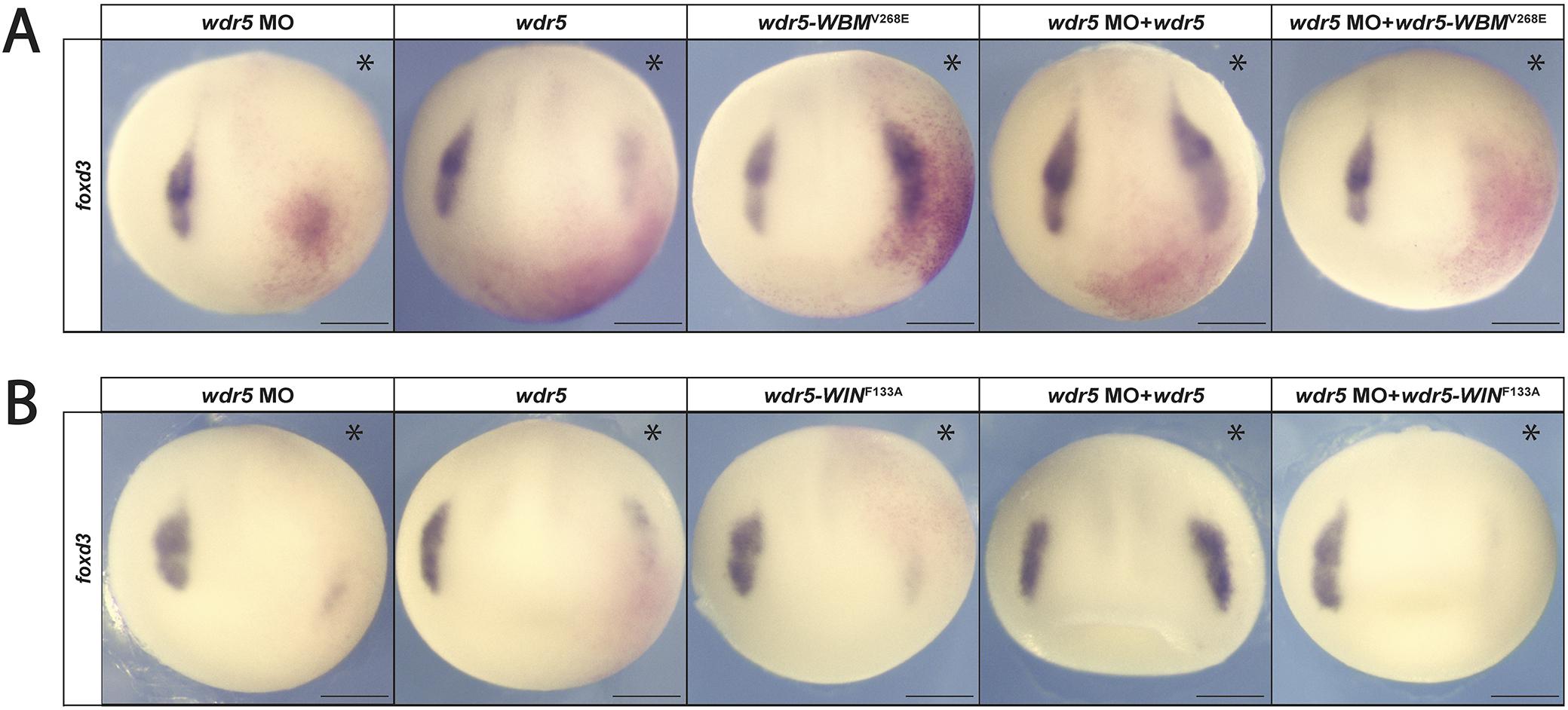 Fig. 6. Both Wdr5 binding sites are required for the expression of neural crest genes. (A) wdr5-WBMV268E overexpression fails to rescue neural crest expression in the absence of endogenous wdr5 expression. (B) wdr5-WINF133A overexpression fails to rescue neural crest expression in the absence of endogenous wdr5 expression. Asterisks indicate the injected side of the embryo. Scale bars: 250[micrometers]. |