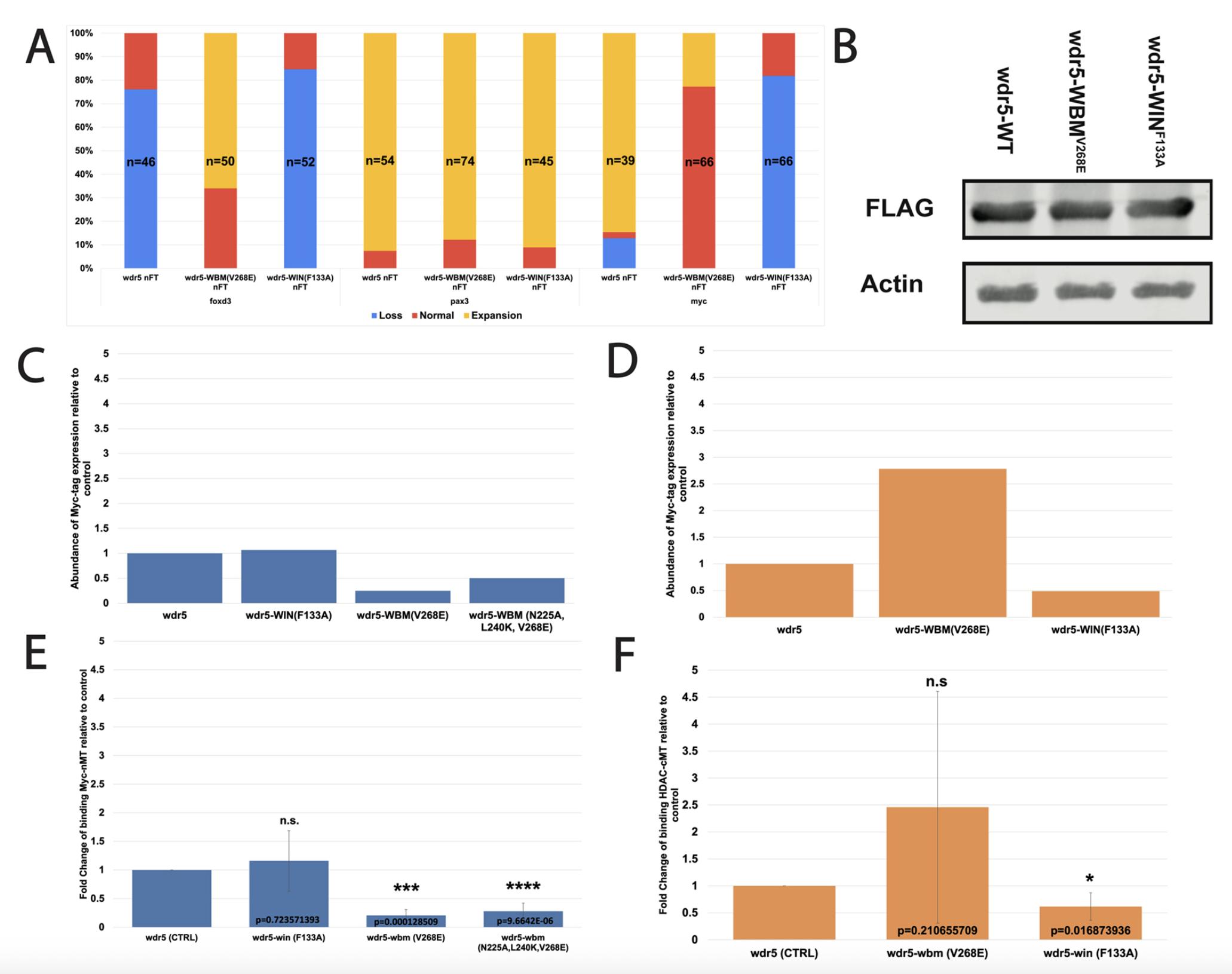 Fig. S4. (A) Percentage bar graph representing whole embryo phenotype counts for wdr5, wdr5-WBMV268, and wdr5-WINF133A injected embryos. (B) Western blot showing equivalent expres-sion of wdr5-WT, wdr5- WBMV268E, wdr5-WINF133A FLAG tag. (C) Co-IP binding analysis of myc+wdr5, wdr5-WBMV268, wdr5-WBMN225A,L240K,V268E, or wdr5-WINF133A pulldown abundance. (D) Co-IP binding analy-sis of myc+wdr5, wdr5-WBMV268, wdr5-WBMN225A,L240K,V268E, or wdr5-WINF133A pulldown abundance. (E) Quantification of Co-IP binding analysis of myc+wdr5, wdr5-WBMV268, wdr5-WBMN225A,L240K,V268E, or