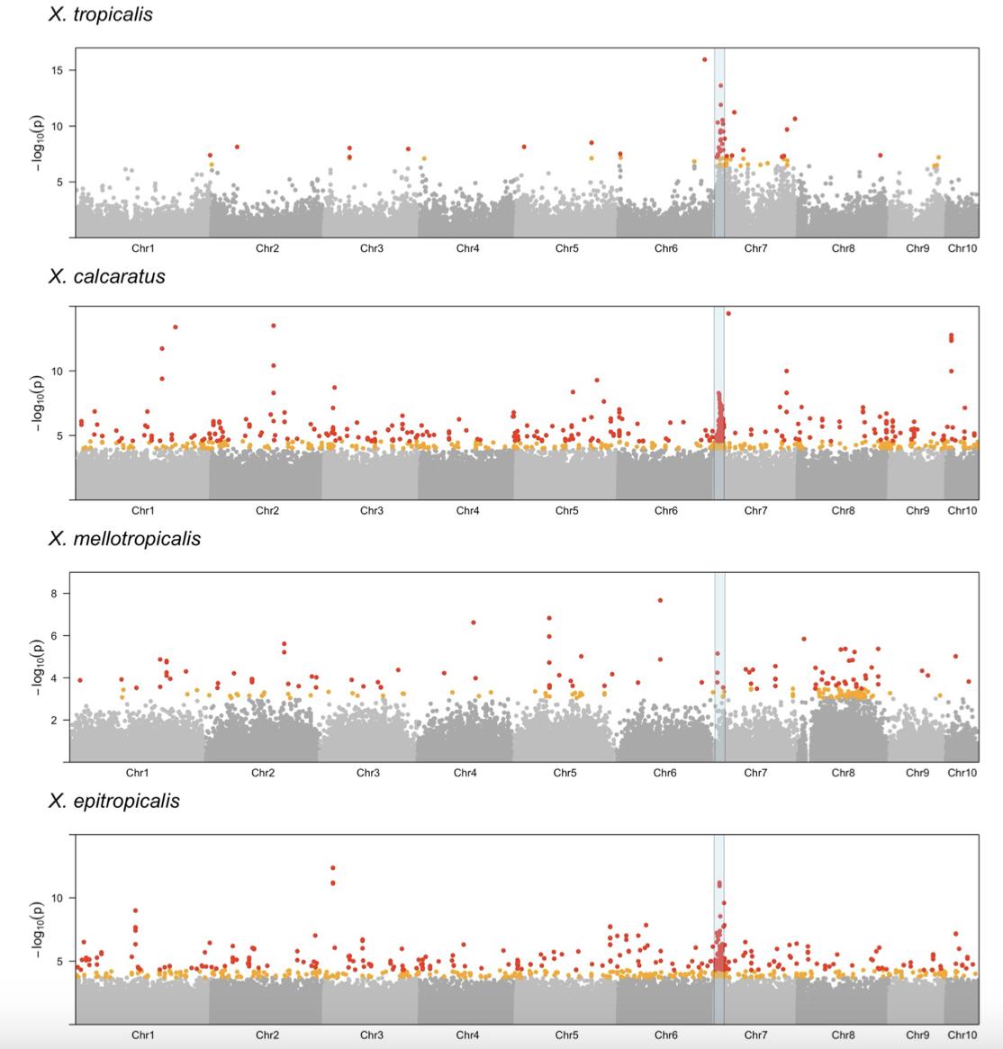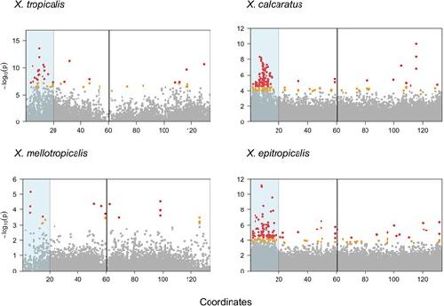 SI Fig. 5. Association between single nucleotide polymorphisms and sex across the whole genome. For the allotetraploid species (X. calcaratus, X. mellotropicalis, X. epitropicalis) data from both subgenomes are mapped to the reference genome from the diploid X. tropicalis. A signal of association of variants in the beginning of chromosome 7 is apparent in all species (albeit weaker for X. mellotropicalis, see main text). |