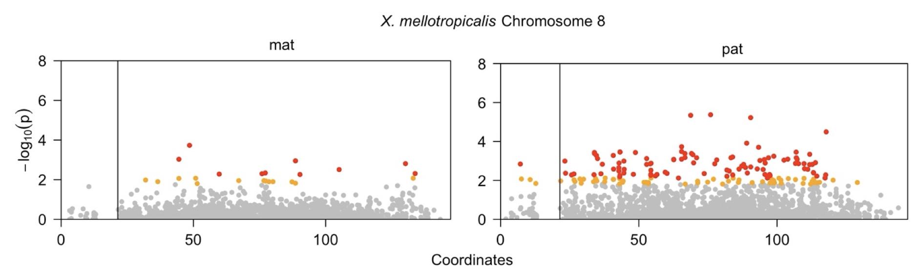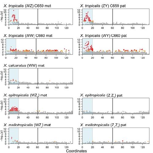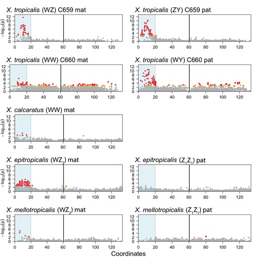 Figure 2.Plots of the probability of association between molecular variation (single nucleotide polymorphisms, SNPs) and sex (female, male) on chromosome 7 evidence conservation of the location of the sex-linked region in all four species in the subgenus Silurana. Gray, orange, and red dots indicate the − log10 transformed probability (p) of tests of the null hypothesis that each SNP is randomly associated with sex, and correspond to > 0.1%, 0.1%–0.05%, or the < 0.05% percentiles, respectively, across genome-wide RRGS variants for each species. Vertical lines indicate the location of the centromere. Results from X. tropicalis and X. mellotropicalis were previously reported (Evans et al., 2024). The signal of sex association on Chr7 in X. mellotropicalis is weak but was previously confirmed using Sanger sequencing (Cauret et al., 2020). |