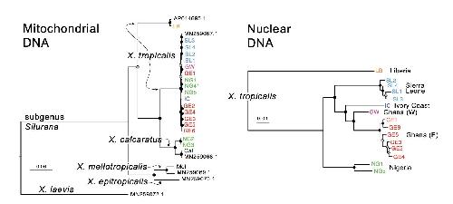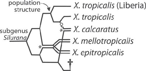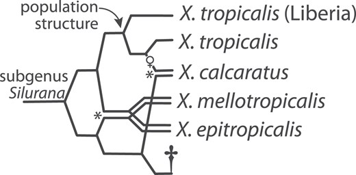 Figure 6.Inferred phylogenetic history of subgenus Silurana, genus Xenopus. Asterisks indicate independent allotetraploidization events, and a female symbol indicates the maternal ancestral lineage for one of these events based on the mitochondrial phylogeny. The sister relationship between X. mellotropicalis and X. epitropicalis is based on mitochondrial genomes and cloned paralogs of the autosomal genes RAG1 and RAG2 (Evans, 2007; Evans et al., 2005; Evans et al., 2019). Two site pattern tests summarized in Tables 3 and 4 and described in the Supplementary material support (a) allotetraploidization of the ancestor of (X. mellotropicalis + X. epitropicalis) before population structure arose in X. tropicalis and (b) allotetraploidization of the ancestor of X. calcaratus after the Liberia lineage became differentiated from other X. tropicalis. A dagger indicates a putative unsampled diploid ancestor. |