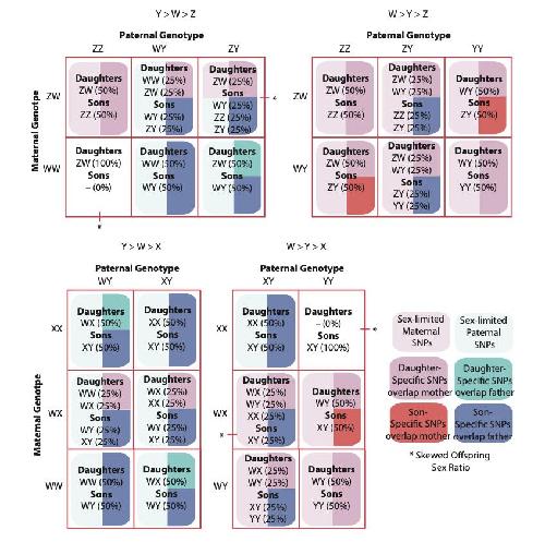 SI Fig. 1. Expectations associated with parental crosses in four types of triple sex chromosomesystems including (top left) Y dominant for maleness over the W and with a Z chromosome, (top right) W dominant for femaleness over the Y and with a Z chromosome, (bottom left) Y dominant for maleness over the W and with an X chromosome, and (bottom right) W dominant for femaleness over the Y and with an X chromosome. As indicated by the legend, colors on the right indicate whether maternal, paternal, or no parental sex-limited SNPs (no color) expected; colors on the left indicate whether daughter-specific and/or son-specific SNPs are expected to overlap with maternal or paternal sex-linked SNPs. The scenario on the top right is genetically equivalent to a scenario with a W chromosome and two diverged Z chromosomes (Z1, Z2), as depicted on the right side of Fig 1. Likewise, the scenario on the bottom left is genetically equivalent to a scenario with a Y chromosome and two diverged X chromosomes (X1, X2). |