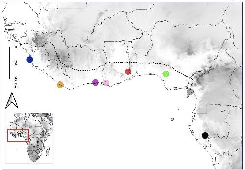 SI Fig. 2. Geographical origins of wild-caught and captive Xenopus samples used for WGS, with detailed locality information provided in Table S1 and colors follow SI Fig. 10. The dotted line demarcates the approximate distribution of Xenopus tropicalis inferred by Tinsley et al. (1996). |