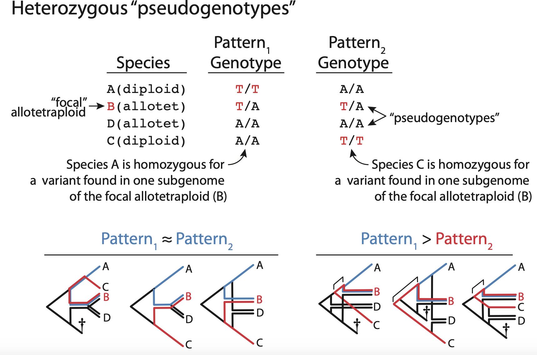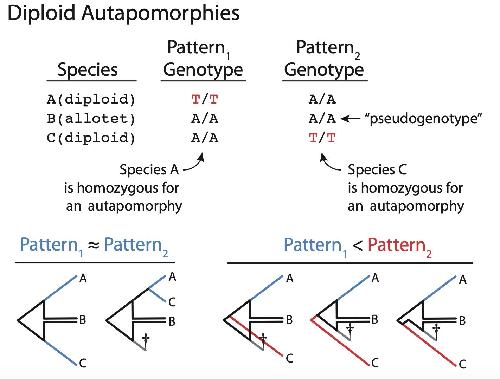SI Fig. 3. Alternative patterns of homozygous “autapomorphies” in diploid whole genome sequences allow us to test whether one or multiple allotetraploidization events occurred in subgenus Silurana. With species B as the focal allotetraploid, we expect the numbers of Pattern1 and Pattern2 sites to be similar under scenarios where divergence between the focal allotetraploid and each diploid is the same (indicated by pairs of blue branches in the left two phylogenies). Under various scenarios such as the three depicted on the right, more Pattern1 than Pattern2 sites are expected if the diploid sample A is more closely related than C to the focal allotetraploid. We assume here that the effective population size and mutation rates are similar in both diploid species; a dagger indicates an unsampled diploid ancestor. |