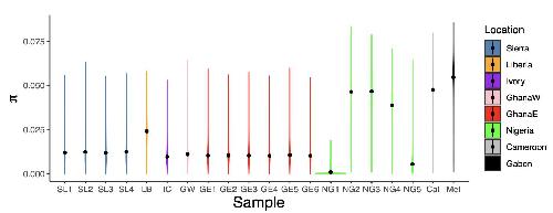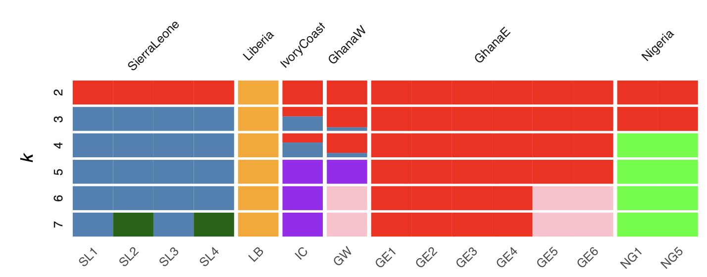 Figure 5.Admixture analysis of X. tropicalis whole genome sequences mapped to the X. tropicalis reference genome distinguishes the Liberia sample from the other geographical isolates. Sample abbreviations are defined in Supplementary Table S1. |
