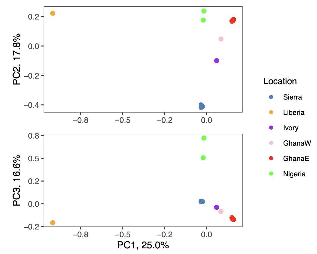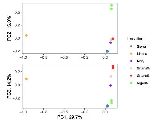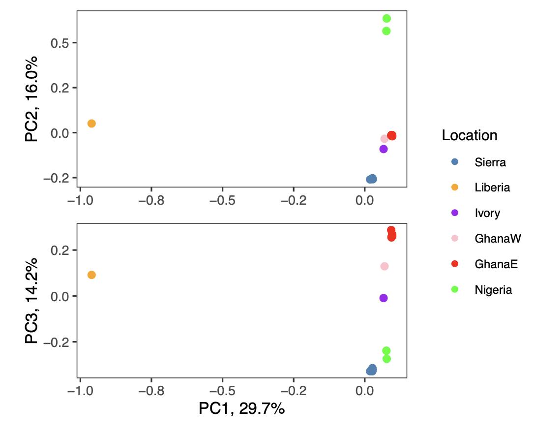 SI Fig. 14. Principal components analysis of X. tropicalis whole genome sequences mapped to the L subgenome of the reference genome of X. laevis also distinguishes the Liberia sample on PC1 and the geographic isolates of other samples on PC2 and PC3. |