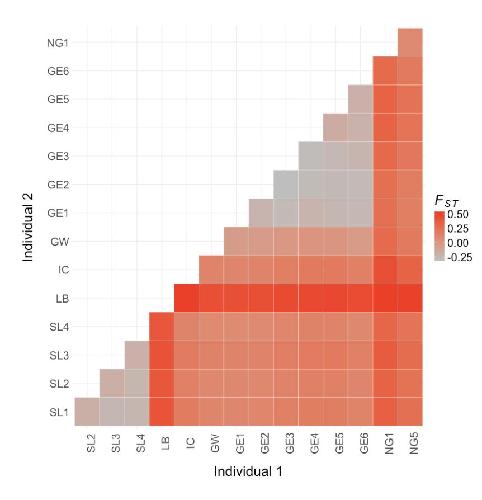SI Fig. 15. A heatmap of the average pairwise FST in 5 Mb windows between whole genome sequences of X. tropicalis mapped to the X. tropicalis reference genome illustrates strong differentiation of the sample from Liberia. Sample abbreviations are defined in Table S1. |