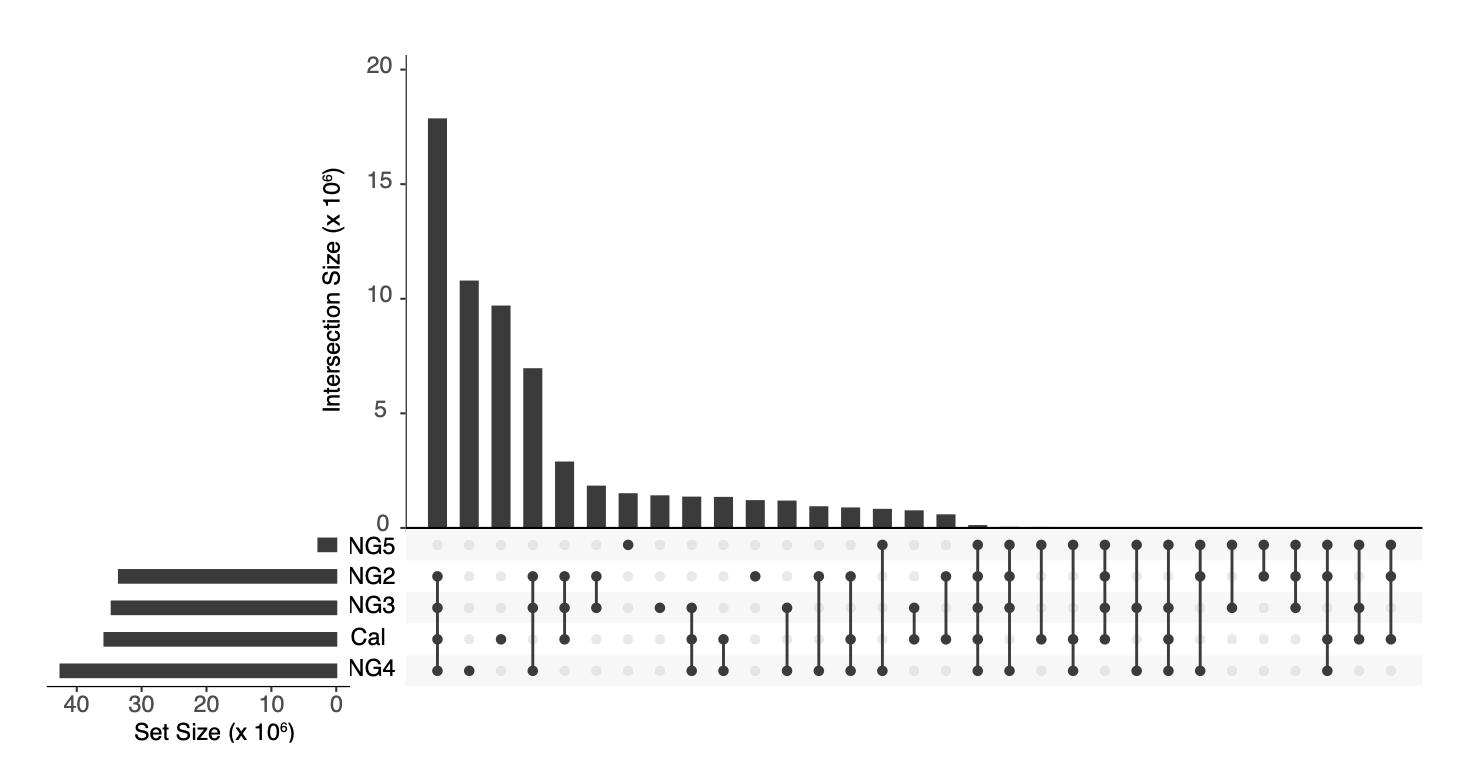 SI Fig. 11. Many heterozygous genotypes are shared between X. calcaratus (Cal) and three of four wild caught samples from Nigeria (NG2, NG3, NG4, but not NG5), which is consistent with inferences based on heterozygosity and mitochondrial DNA that NG2 and NG3 are X. calcaratus and that NG4 is a polyploid X. tropicalis/X. calcaratus hybrid that carries a X. tropicalis mitochondrial genome. |