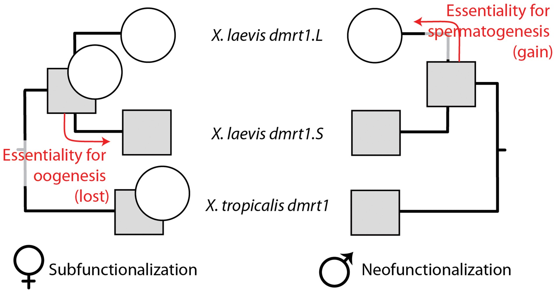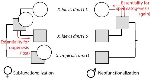 In females (left) subfunctionalization occurred when essentiality for female fertility, ovarian development, and oogenesis (circles) was lost in dmrt1.S; in males (right), neofunctionalization occurred when essentiality for male fertility and sperm (circles) was acquired in dmrt1.L. Squares indicate a non-essential subfunction that may partially overlap with the circles; based on patterns of expression divergence [34], this subfunction is probably mostly restricted to somatic cells in the male gonad.