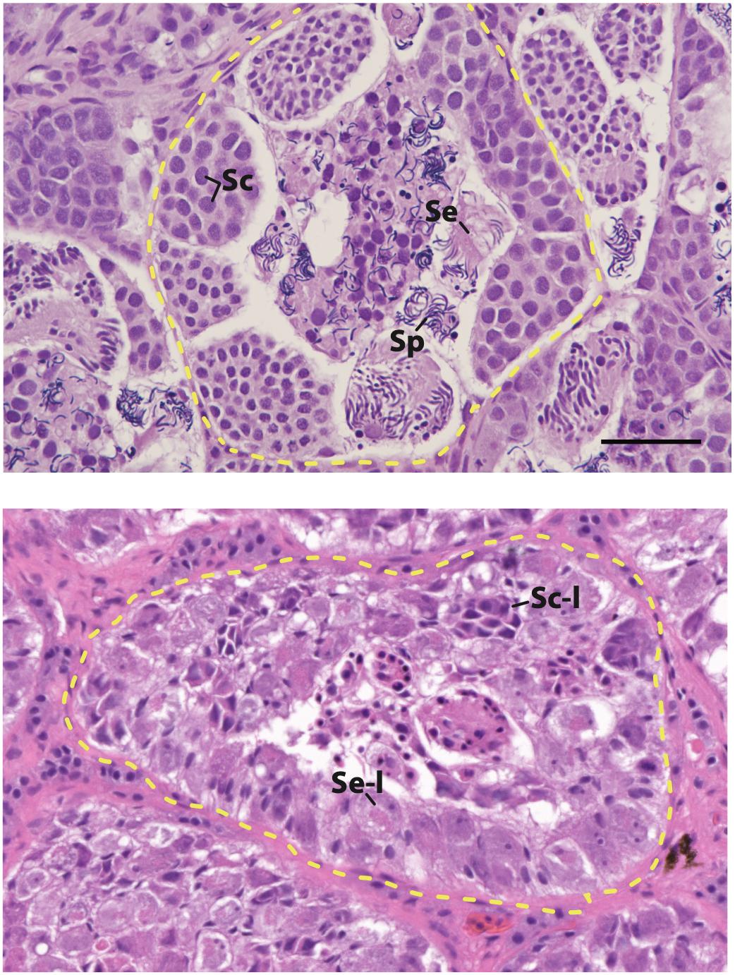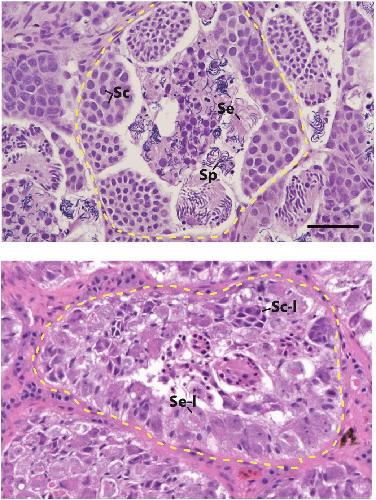 [Supplementary Figures] Fig C. Additional examples of testis morphology with labeling and black scale bar following Fig 2, including a wildtype individual (top: individual 185E) and a dmrt1.L homozygous knockout (bottom: individual 1880). A dotted yellow line in each image demarcates a seminiferous tubule. Scale bar is 50[micrometers].