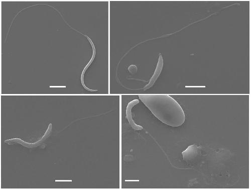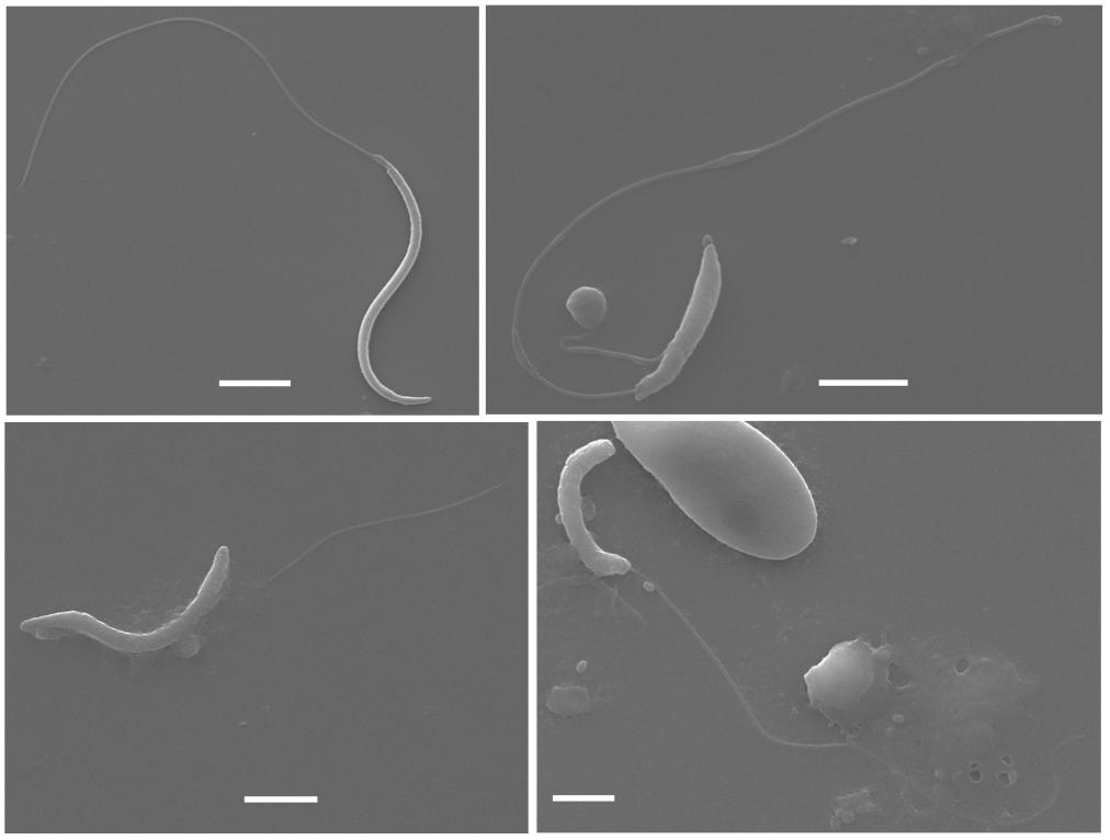 [Supplementary Figures] Fig D. Scanning electron microscopy images of wildtype sperm (top left) and sperm from X. laevis homozygous knockout for dmrt1.L. Scale bars are 5[micrometers].