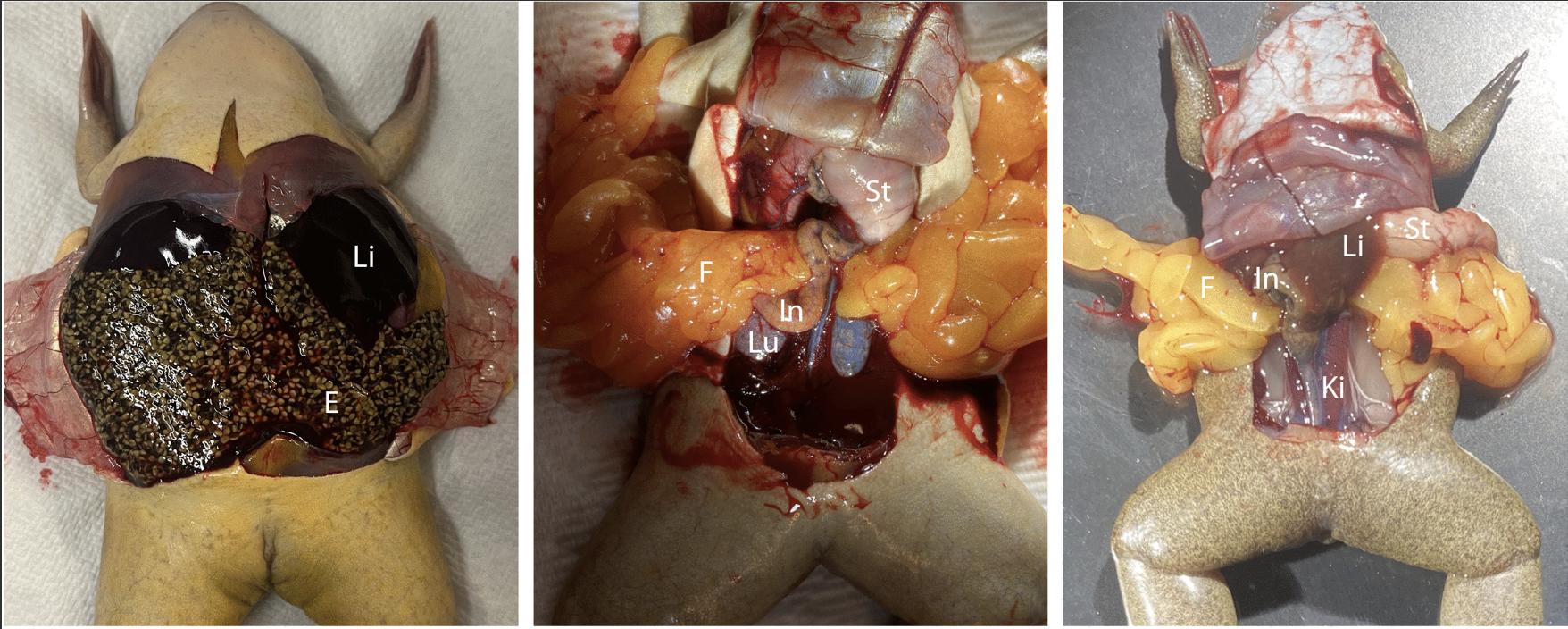 Fig 1. Dissected ventral views of a X. laevis wildtype female (left), and female knockouts for dmrt1.L (X. laevis, center) and dmrt1 (X. tropicalis, right). The egg-filled oviduct (E) is visible in wildtype females but knockouts of X. laevis dmrt1.L and X. tropicalis dmrt1 do not develop eggs; these animals have large fat bodies (F; orange-yellow structures), which are also present but much smaller in wildtype females (in the left, this obscured by the egg-filled oviduct). Other organs are labeled including the liver (Li), intestine (In), Lung (Lu), Stomach (St), and Kidney (Ki). Sample identification numbers are X. laevis wildtype: female5; X. laevis female knockout for dmrt1.L: female1; X. tropicalis female knockout for dmrt1: female1.