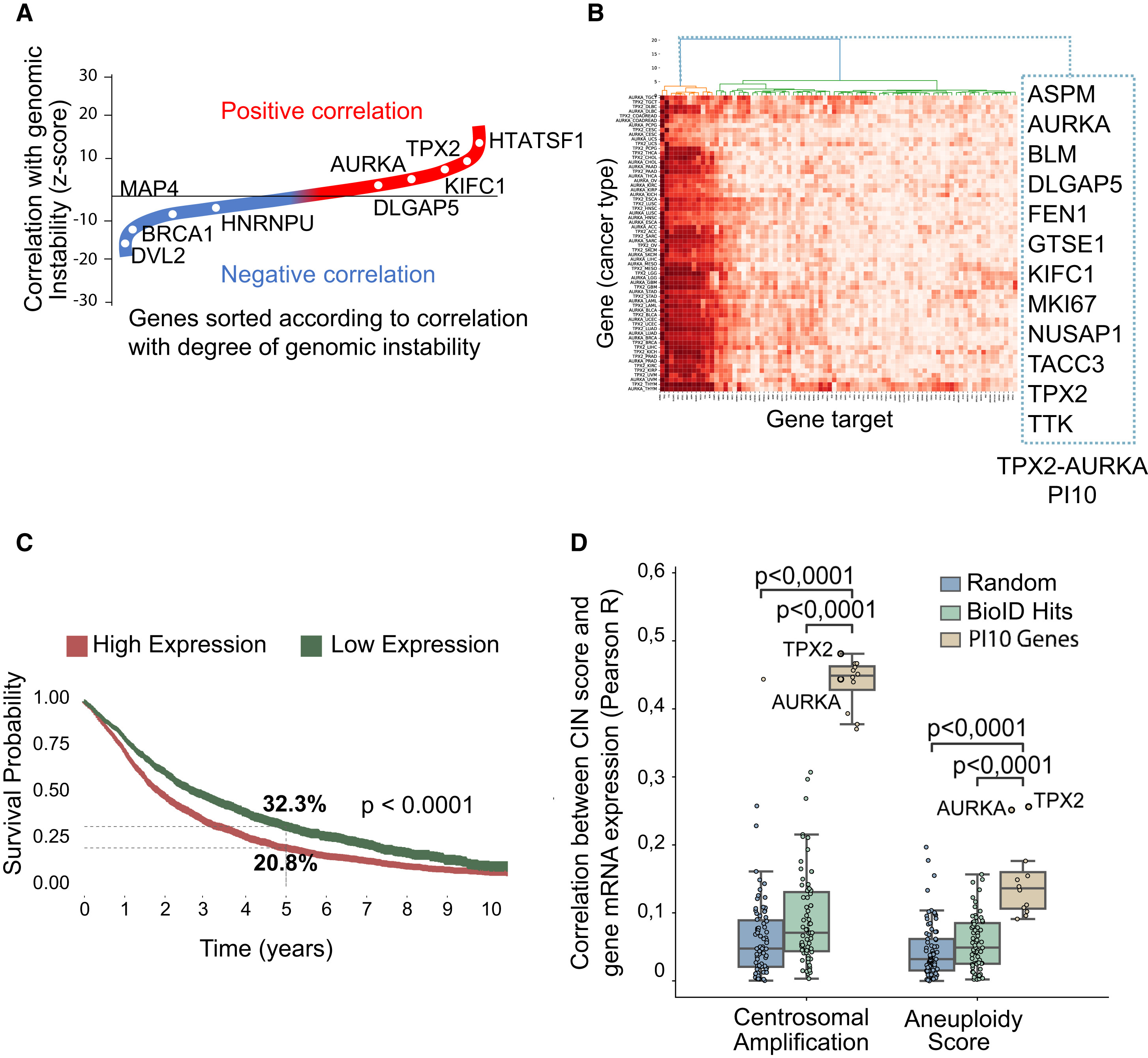 (A) Sorted associations between the expression of the TPX2 and AURKA proximity interactors and genomic instability.
