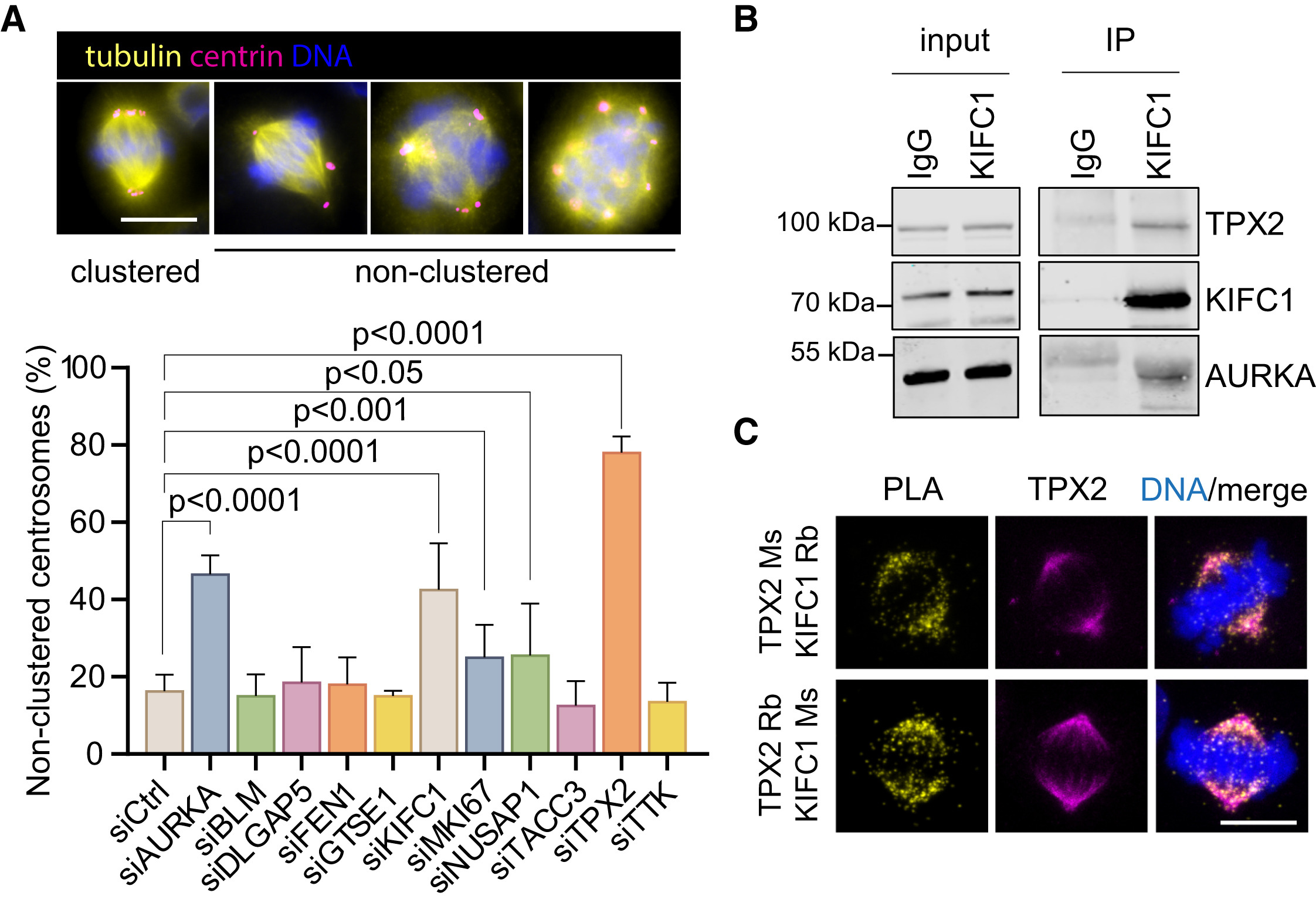 Figure 3. TPX2, AURKA, and KIFC1 have a role in centrosome clustering and interact in mitosis