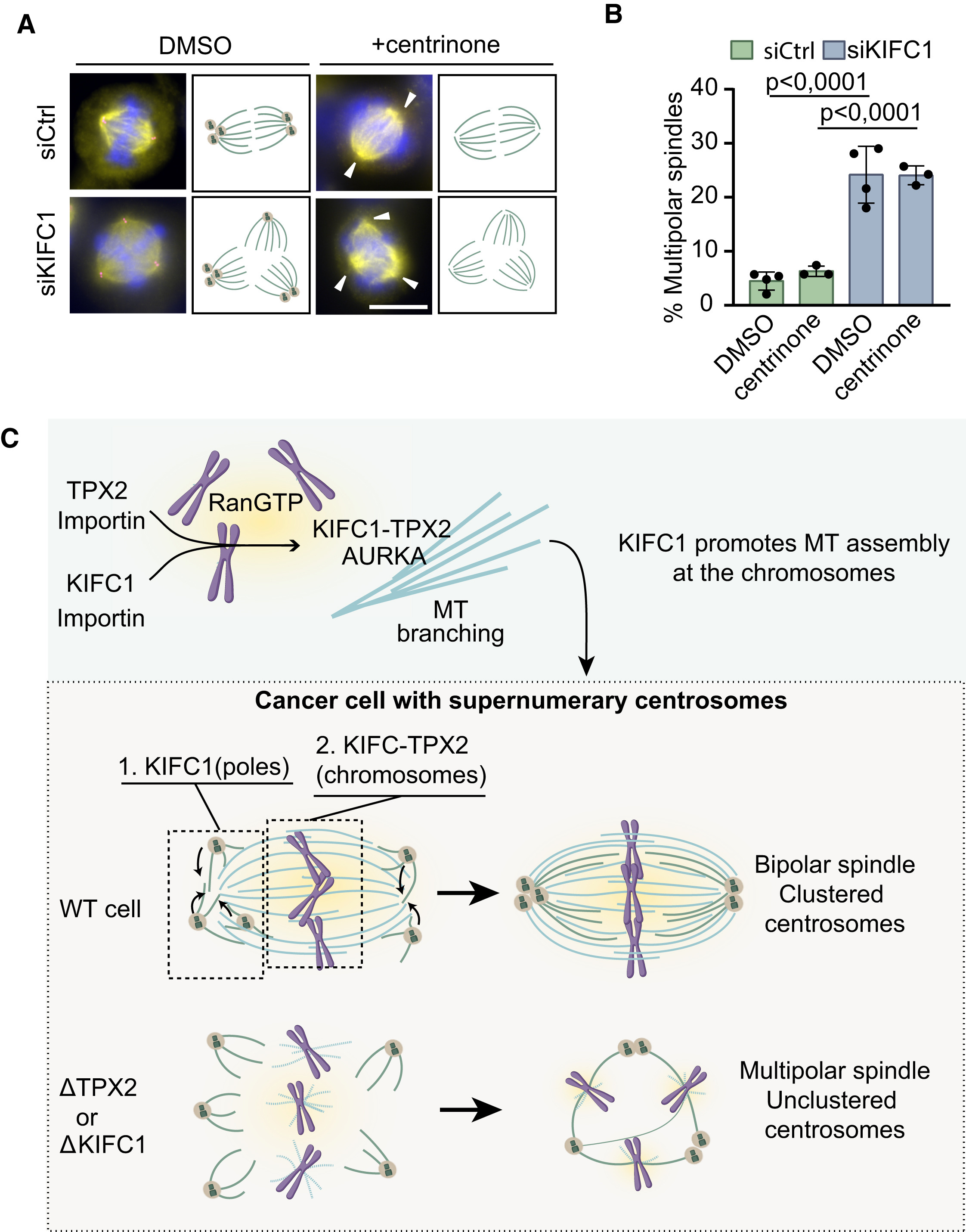 (A) Representative control (siCtrl) and KIFC1-silenced (siKIFC1) spindles from MDA-MB-231 cells upon DMSO or centrinone incubation. Tubulin (yellow), centrin (magenta), and DNA (blue). Drawings represent clustered centrosomes in a bipolar spindle (DMSO/siCtrl), unclustered centrosomes in a multipolar spindle (DMSO/siKIFC1), acentrosomal bipolar spindle (centrinone/siCtrl), and acentrosomal multipolar spindle (centrinone/siKIFC1). White arrows highlight acentrosomal poles. Scale bar, 10 um.
