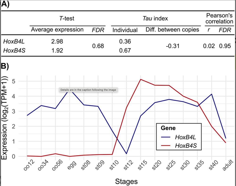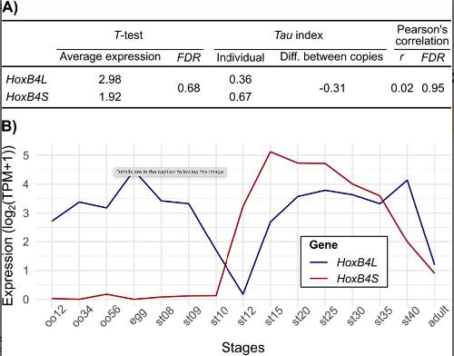 Figure 1. Expression patterns of HoxB4L and HoxB4S homeologues. (A) Comparison of average expression levels between homeologues was performed using two-tailed T-tests. Expression specificity was assessed via the Tau index (calculated for each copy and its difference), and overall expression profiles were compared using Pearson's correlation coefficients. (B) Temporal expression of HoxB4L and HoxB4S across developmental and adult stages of Xenopus laevis.