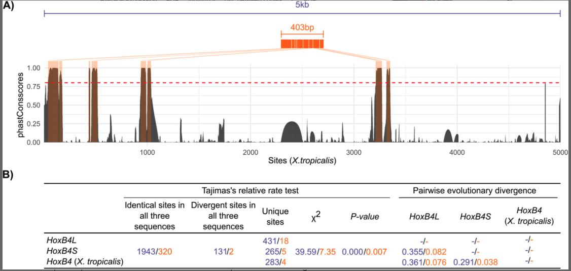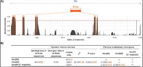 Figure 2. Evolutionary analyses of putative cis-regulatory regions at the HoxB4L/S loci. (A) Full 5 kb upstream regions of X. laevis HoxB4L/HoxB4S and X. tropicalis HoxB4 (purple), with conserved regions (orange) identified based on phastCons scores > 0.8 (red dashed line). Coordinates and sequence length of X. tropicalis were used as a reference. (B) Tajima's relative rate tests and pairwise estimates of sequence divergence for the full 5 kb upstream region (purple) and for the concatenated sequence of the eight highly conserved regions across amphibian genomes (orange).