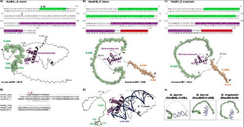 Figure 3. In silico analyses of HoxB4 proteins. (A–C) Primary structures and AlphaFold-predicted 3D models of X. laevis HoxB4L (A), HoxB4S (B), and X. tropicalis HoxB4 (C) (Abramson et al. 2024). Colours indicate N- and C-terminal intrinsically disordered regions (IDRs) and the homeodomain. Letters below each residue denote secondary structure predicted by PROTEUS2 (Montgomerie et al. 2008) (C = coil; E = β-strand; H = helix). In (A), arrows highlight the four amino acid residues under positive selection. In the structural models, H1-H3 refer to homeodomain helices; arrows indicate the first (white) and last (black) residues of each IDR. Average pLDDT scores are shown. (D) Alignment of the N-IDR region, showing high conservation scores for the 22-residue segment corresponding to HoxB4L, except for the three positively selected sites indicated by red arrows. Symbols denote residue conservation: (*) identical; (:) conservative substitution; (.) semi-conservative substitution; () non-conservative substitution. (E) Predicted HoxB4L-Irx5L complex generated with HADDOCK 2.4 (Honorato et al. 2024), showing helix H3 inserted into the DNA major groove and the TAAT motif on the 5′-3′ strand. The four residues under positive selection are highlighted (green and grey sticks). (F) Distinct spatial arrangements of the N-IDRs of the HoxB4 proteins, revealing different orientations of Irx5 DNA (blue cartoon) in each complex.