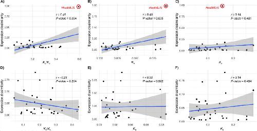 Figure 4. Correlation analyses between expression divergence and coding sequence evolution. Positive correlations are observed between expression dissimilarity (ED) and the ratio of nonsynonymous to synonymous substitutions (Ka/Ks) (A), nonsynonymous divergence (Ka) (B), and synonymous divergence (Ks) (C). However, these correlations are not significant when the outlier HoxB4L/S is excluded from the analyses (D–F).