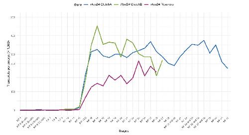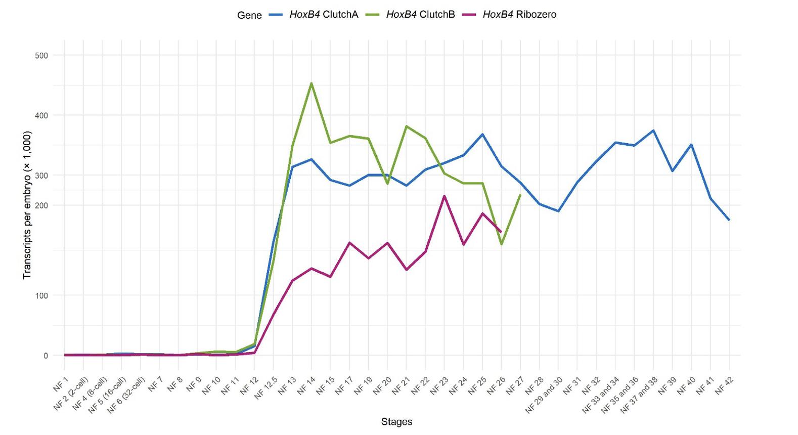 Figure S1. Temporal expression profile of HoxB4 in Xenopus tropicalis. Expression levels of HoxB4 across embryonic development are shown based on RNA-seq data from Owens et al. (2016). Profiles are shown for two independent, synchronously developing in vitro fertilization clutches (Clutch A, blue; Clutch B, green) and for ribo-depleted RNA-seq data (Ribo-zero, magenta). The x-axis indicates developmental stages, and the y-axis represents transcript abundance expressed as transcripts per embryo (×1,000). No detectable HoxB4 expression is observed during maternally regulated stages (NF 1-8/9), with expression initiating after the maternal-to-zygotic transition and increasing during gastrulation and subsequent developmental stages.