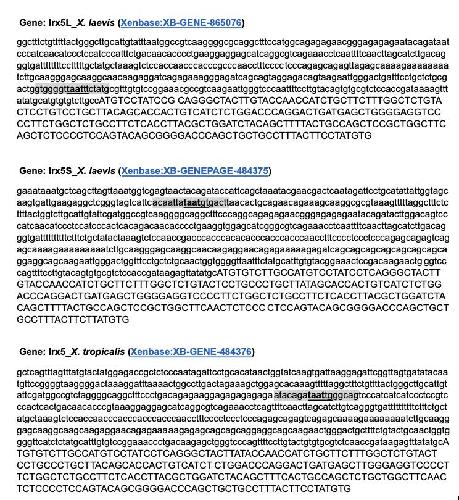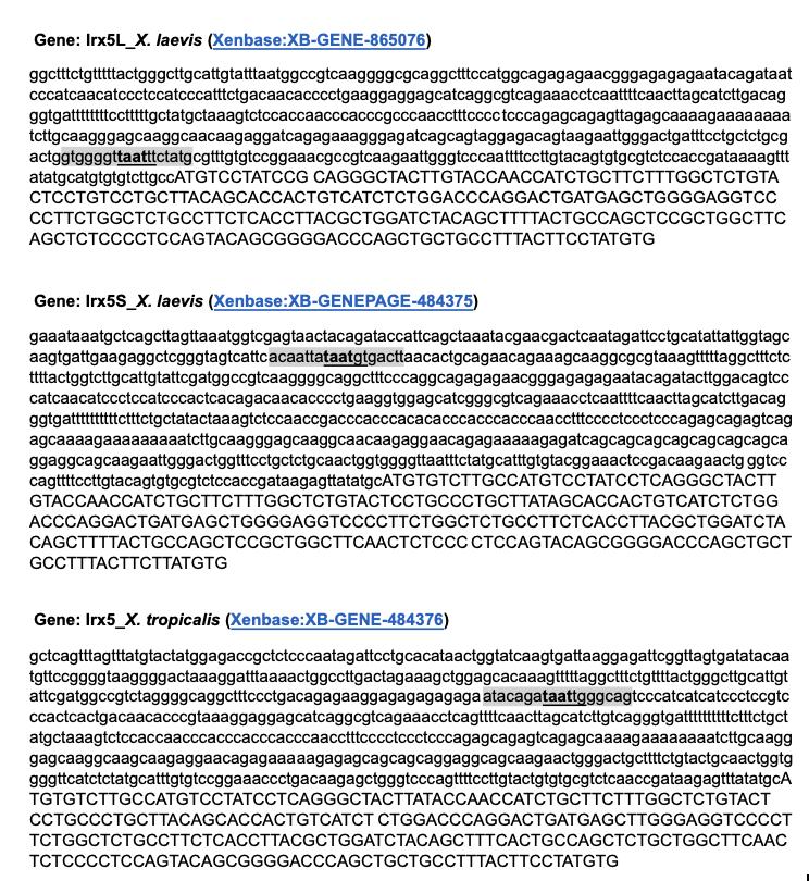 Figure S2. Nucleotide sequences of Irx5 genes used to model DNA fragments for molecular docking analyses with HoxB4 proteins. The 5′ upstream regions (lowercase) and the first coding sequences (uppercase) of each gene are shown. The 18-bp segments containing the TAAT motif (bold) are highlighted and the two immediately downstream nucleotides, defined as the active sites for the docking simulations, are underlined. All sequences were retrieved from the Alliance of Genome Resources using the “Genomic with full introns ±500 bp upstream/downstream” option.