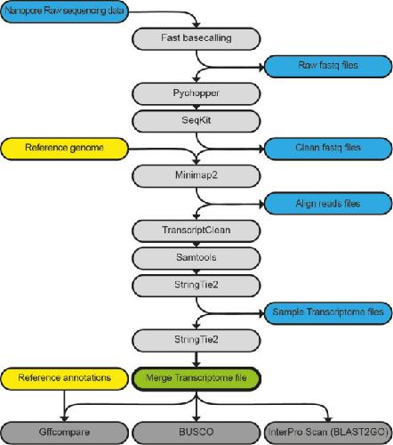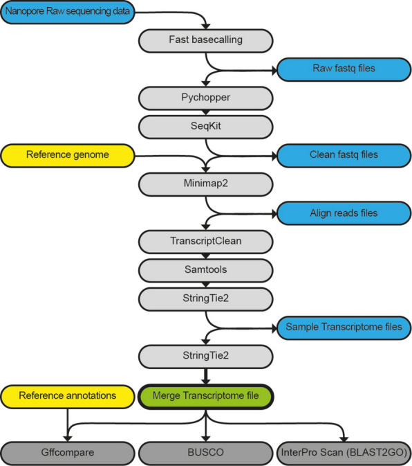 Fig. 1. Pipeline for long-read data processing. Round boxes: files; square boxes: software programmes. Blue boxes: obtained files; yellow boxes: reference files; green box: final transcriptome file; light-grey boxes: software for processing data; dark-grey boxes: software for evaluating quality of obtained transcriptome file