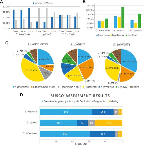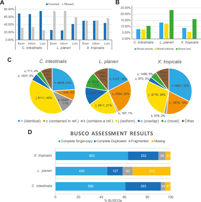 Fig. 2. Transcriptome quality assessments. A Covered (blue) and missed (grey) exons/intron/loci for each species data set. B Novel exon (blue), intron (yellow), and loci (green) for each species data set. C Pie plots showing the distribution of transcript-matching types according to gffcompare categories: = (light-blue), identical reference-query match; c (orange), complete query match within reference; k (grey), complete reference match within query; j (yellow), some splice site mismatch (potential new isoform); o (dark-blue), partial overlapping match; u (green), no match of query within reference (novel); Other (brown), other types of query-reference matches including m (all introns retained), n (some introns retained), e (single exon match), s (intron match on opposite strand), x (exon match on opposite strand), i (contained within reference intron), y (reference contained within intron), p (possible polymerase run-on), and r (repeat). D Histogram showing the amount of evolutionary conserved orthologues (BUSCOs) found, as single-copy (light blue), duplicated (dark blue) or fragmented (grey), and missing (yellow)