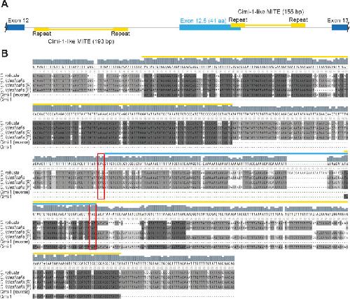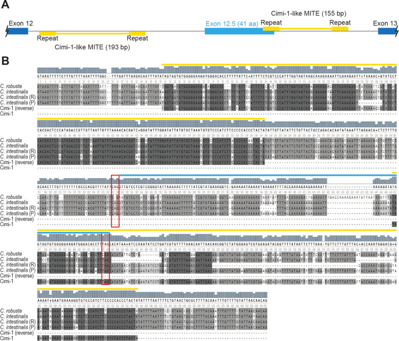 Fig. 4. Schematic of CiTCF intron 12. A Schematic of the C. intestinalis genomic region where exon 12.5 is found. B DNA alignment of TCF intron 12 of C. intestinalis and C. robusta. C. intestinalis (R): sequence from Roscoff reference genome (GCA_018327825.1); C. intestinalis (P): sequence from Plymouth reference genome (GCA_018327805.1); dark blue: annotated exons; light blue: new exon (exon 12.5); yellow: Cimi-1-like sequences; red boxes: acceptor site and stop codon of exon 12.5