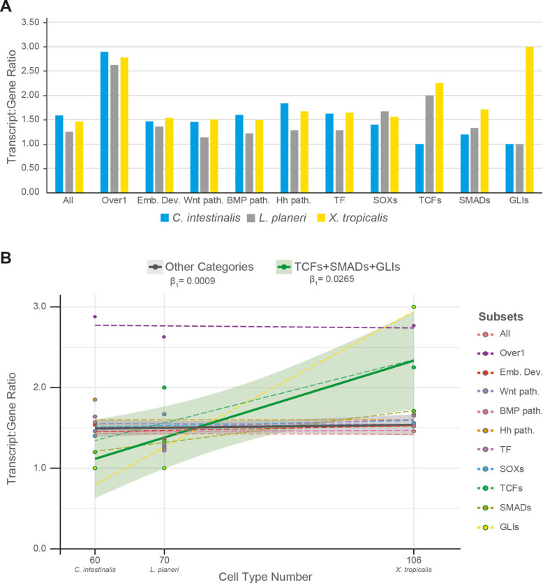 Fig. 3. Transcript:gene ratio. A Histogram of the transcript:gene ratios (t/g ratio) for each species (blue: Ciona intestinalis; grey: Lampetra planeri; yellow: Xenopus tropicalis) and category (All: whole transcriptome; Over 1: genes with more than one transcript; Emb. Dev: genes with the GO term ‘Embryo Development’ (GO:0009790); Wnt path.: genes with the GO term ‘Wnt signalling pathway’ (GO:0016055); BMP path.: genes with the GO term ‘BMP signalling pathway’ (GO:0008101 or GO:0030509); Hh path.: genes with the GO term ‘smoothened signalling pathway’ (GO:0007224); SOXs: SOX genes; TF: genes with the GO term ‘DNA-binding transcription factor activity’ (GO:0003700); TCFs: TCF and TCF/LEF genes; SMADs: SMAD genes; GLIs: GLI genes). B Linear regressions of each subset studied (dotted lines) and for the two groups used for the Mann–Whitney U test (solid lines): ‘Other categories’, encompassing All, Emb. Dev., Wnt path., BMP path., Hh path., TF and SOXs (grey line), and ‘TCFs + SMADs + GLIs’, encompassing those three gene families (green line). The t/g ratio is plotted against the cell type number in development for each species, according to Cao et al.46 for Ciona, Pang et al.47 for lamprey, and Liao et al.48 for Xenopus. Dots: Transcript:Gene ratio values. Dot outline: belonging to group, ‘TCFs + SMADs + GLIs’ (green) or ‘Other categories’ (grey). β1: regression coefficient