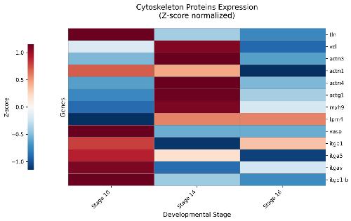 Figure 2. Relative stage-specific dynamics of Zyxin-associated structural and adhesion proteins. Heatmap depicts the stage-resolved association patterns of core cytoskeletal and focal adhesion proteins with the Zyxin complex. The color scale (red/blue) represents row-wise Z-scores, indicating whether the Z/C ratio for a given protein at a specific stage is above (red) or below (blue) its own mean value across all three stages. This normalization highlights the temporal dynamics of each protein relative to its own baseline. Notable patterns include the stable, constitutive association of the adhesome core components Talin-1 and Vinculin, the sharp, transient recruitment peak of α-actinin-3 and α-actinin-4 at stage 14, the progressive engagement of Myosin-9, and the absence of specific enrichment for Integrin subunits.