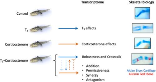 Fig. 6. T3 and CORT cross-talk affects skeletal development during metamorphosis. A) Schematic diagram of treatment with T3 or/and CORT for phenotypic analysis. B) CORT treatment does not affect limb size. Bone surface was used as a proxy to follow limb size for each treatment indicated in panel A. Box plots represent changes of bone surface (n = 4/treatment condition), and box plots with the same letter are not significantly different (p < 0.05; Mann-Whitney test). C) T3 and CORT cotreatment accelerate bone formation. Skeletal preparation (Alcian/Alizarin) of the same samples (left panel). Cartilage is stained with alcian blue and bone with alizarin red. Morphology of hindlimb buds 24 h after a 24 h treatment (right panel). D) T3 induced bone formation increase with CORT treatment. Measurement of bone surface area to cartilage surface area ratio from data presented in panel C. Histograms represent the bone cartilage ratio (n = 4/treatment condition), and histograms with the same letter are not significantly different (p < 0.05; Mann-Whitney test). E) Bone structures appear just before metamorphic climax. Skeletal preparation (Alcian/Alizarin) of natural metamorphosis samples showing developmental stages from NF55 to NF58. Bone structures normally start to appear at stage NF57 and are clearly present at stage NF58. Cartilage is stained with alcian blue and bone with alizarin red. F) Schematic diagram of treatment with CORT for 24h at two stages of natural metamorphosis: NF 59 before climax and NF61 at metamorphic climax. Phenotypic analysis was done after completion of metamorphosis stage NF66. G) CORT treatment before climax leads to smaller limb length. Measurement of froglet hindlimb lengths following treatment protocol presented in panel F. Box plots represent the limb length (n = 23 and n = 21 for respectively control and CORT condition), and box plots with the same letter are not significantly different (p < 0.05; Mann-Whitney test). CTRL = control; T3 = 3,3',5-triiodothyronine; CORT = corticosterone; T3+CORT = 3,3',5-triiodothyronine + corticosterone. (For interpretation of the references to color in this figure legend, the reader is referred to the Web version of this article.) |
