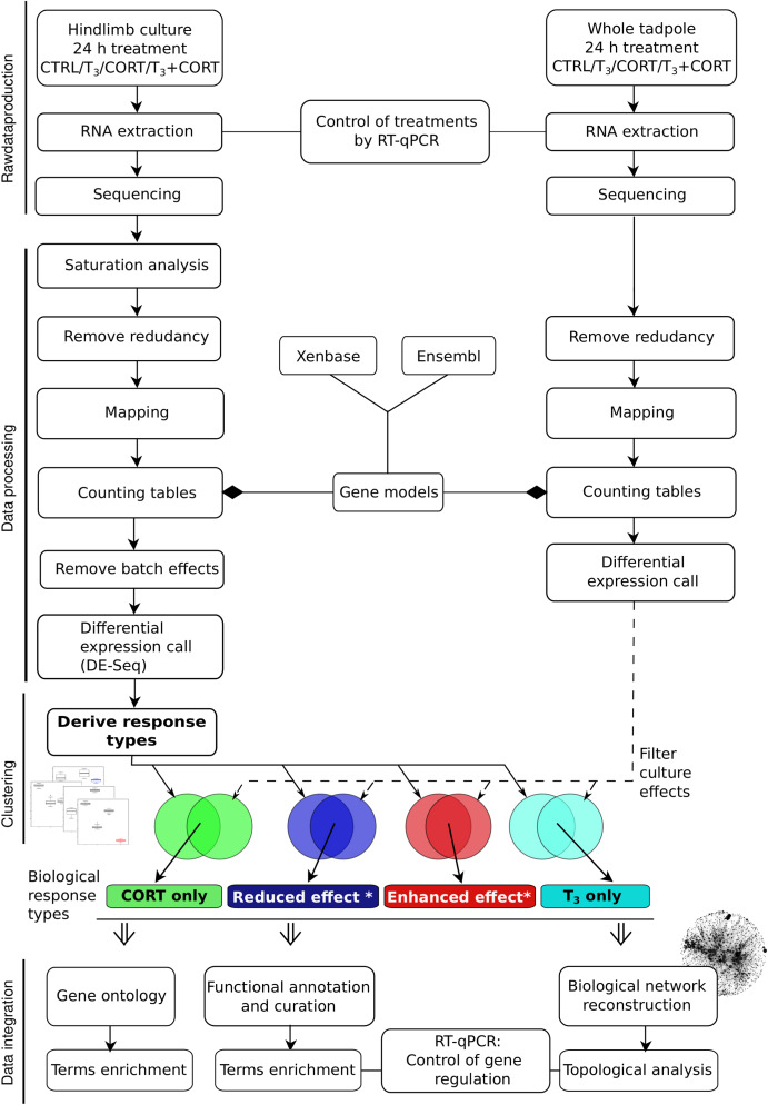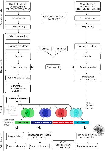Fig. 1. General workflow of data production, processing and analysis. CTRL = control; T3 = 3,3',5-triiodothyronine; CORT = corticosterone; T3+CORT = 3,3',5-triiodothyronine + corticosterone. |