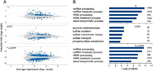 Fig. 2. T3 and CORT affect hindlimb transcriptome. A) Relationship between the mean expression level and the difference of expression measured by RNA-Seq (MA plot). Genes reported as differentially expressed by DESeq (FDR = 0.05) relative to the control are colored in blue. B) The five most significant biological terms or pathologies associated to T3, CORT or T3+CORT differentially expressed genes. The numbers in parentheses correspond to the number of genes for each term. CTRL = control; T3 = 3,3',5-triiodothyronine; CORT = corticosterone; T3+CORT = 3,3',5-triiodothyronine + corticosterone. (For interpretation of the references to color in this figure legend, the reader is referred to the Web version of this article.) |