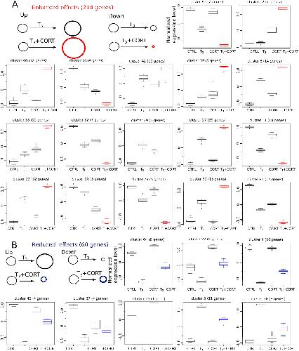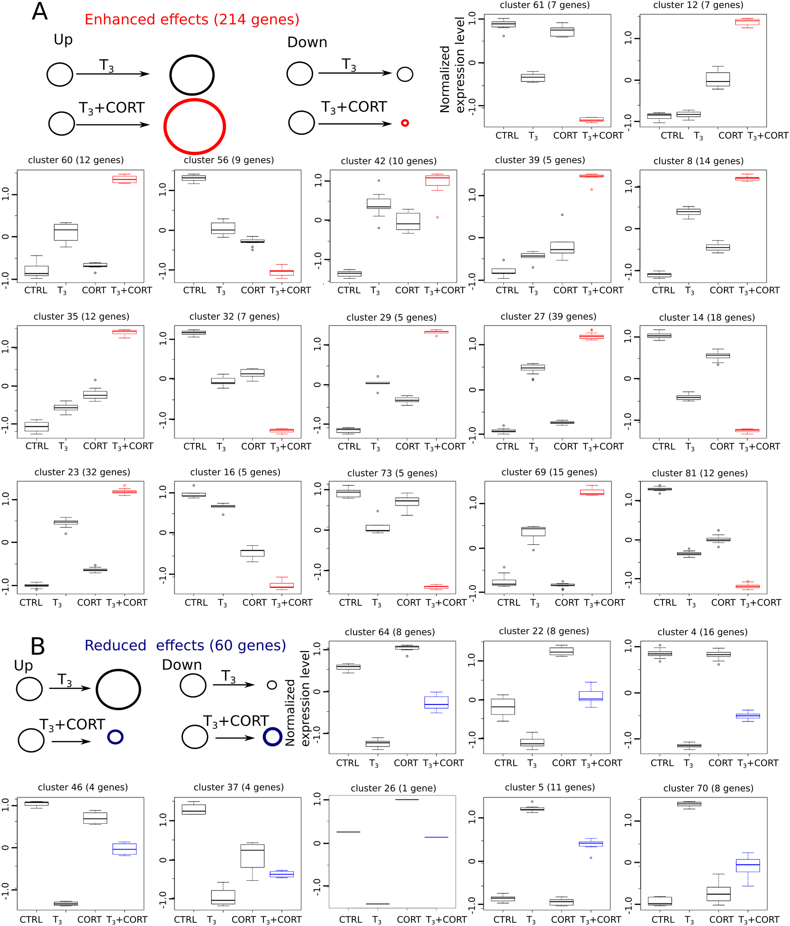 Fig. 3. Profiles with interactions between T3 and CORT signaling. Transcriptome analysis reveals 25 expressions profiles showing crosstalk between T3 and CORT signaling. A) “Enhanced effects” correspond to 17 clusters and 214 genes. CORT increases TH induced expression (clusters UP 8, 12, 23, 27, 29, 35, 39, 42, 60 and 69) or TH induced repression (clusters Down 14, 16, 32, 56, 61, 73 and 81). B) “Reduced effects” correspond to 8 clusters and 60 genes. CORT reduces TH induced expression (clusters Up 5 and 70) or TH induced repression (clusters Down 4, 22, 26, 37, 46 and 64). The number in parentheses above each cluster corresponds to the number of genes exhibiting this expression profile. For each gene, the expression level was adjusted to a variance of 1, and normalized by the mean expression level across all four conditions. Within each cluster, expression values are summarized by a box plot. Upper and lower “hinges” correspond to the first and third quartiles. The upper and lower whiskers extend from the hinge to respectively the highest or lowest value that is within 1.5 times the inter-quartile range of the hinge. Data beyond the end of the whiskers are outliers and plotted as points. CTRL = control; T3 = 3,3',5-triiodothyronine; CORT = corticosterone; T3+CORT = 3,3',5-triiodothyronine + corticosterone. |