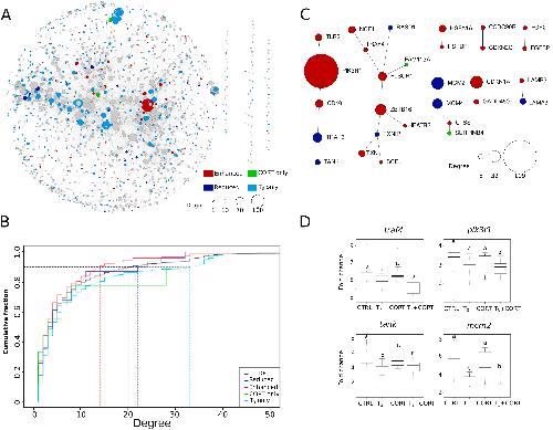 Fig. 5. Interaction network between genes differentially expressed. A) Network of KEGG pathways. B) Cumulative density of the number of connections per node. C) Subnetworks of nodes corresponding to differentially expressed genes directly connected. D) RT-qPCR validation of the expression following T3, CORT and T3+CORT treatments of 4 genes selected from the subnetwork panel C. Box plots represent the fold changes (n = 10/treatment condition), and box plots with the same letter are not significantly different (p < 0.05; Mann-Whitney test). The size of nodes is proportional to the number of connections they have with other nodes. CTRL = control; T3 = 3,3',5-triiodothyronine; CORT = corticosterone; T3+CORT = 3,3',5-triiodothyronine + corticosterone. |