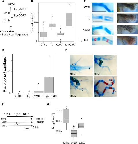 Fig. 6. T3 and CORT cross-talk affects skeletal development during metamorphosis. A) Schematic diagram of treatment with T3 or/and CORT for phenotypic analysis. B) CORT treatment does not affect limb size. Bone surface was used as a proxy to follow limb size for each treatment indicated in panel A. Box plots represent changes of bone surface (n = 4/treatment condition), and box plots with the same letter are not significantly different (p < 0.05; Mann-Whitney test). C) T3 and CORT cotreatment accelerate bone formation. Skeletal preparation (Alcian/Alizarin) of the same samples (left panel). Cartilage is stained with alcian blue and bone with alizarin red. Morphology of hindlimb buds 24 h after a 24 h treatment (right panel). D) T3 induced bone formation increase with CORT treatment. Measurement of bone surface area to cartilage surface area ratio from data presented in panel C. Histograms represent the bone cartilage ratio (n = 4/treatment condition), and histograms with the same letter are not significantly different (p < 0.05; Mann-Whitney test). E) Bone structures appear just before metamorphic climax. Skeletal preparation (Alcian/Alizarin) of natural metamorphosis samples showing developmental stages from NF55 to NF58. Bone structures normally start to appear at stage NF57 and are clearly present at stage NF58. Cartilage is stained with alcian blue and bone with alizarin red. F) Schematic diagram of treatment with CORT for 24h at two stages of natural metamorphosis: NF 59 before climax and NF61 at metamorphic climax. Phenotypic analysis was done after completion of metamorphosis stage NF66. G) CORT treatment before climax leads to smaller limb length. Measurement of froglet hindlimb lengths following treatment protocol presented in panel F. Box plots represent the limb length (n = 23 and n = 21 for respectively control and CORT condition), and box plots with the same letter are not significantly different (p < 0.05; Mann-Whitney test). CTRL = control; T3 = 3,3',5-triiodothyronine; CORT = corticosterone; T3+CORT = 3,3',5-triiodothyronine + corticosterone. (For interpretation of the references to color in this figure legend, the reader is referred to the Web version of this article.) |