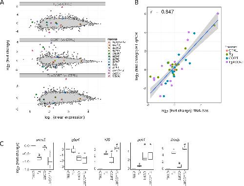 Figure S2. RT-qPCR validations of gene expression levels measured by RNA-Seq. Thirteen genes were chosen from RNA-Seq results over wide dynamic range of expression, as illustrated on the MA plots (A). Expression levels were measured by RT-qPCR and normalized using rpl8 as internal control, with three biological replicates. The relationship between fold changes (in log2 scale) measured by RT-qPCR and by RNA-Seq is shown in panel B. Expression profiles for 5 genes are presented in panel C. Box plots represent the log2 fold change (n = 10/treatment condition). Letters a and b indicate significant differences between the group means based on a Mann-Whitney test. CTRL = control; T3 = 3,3',5-triiodothyronine; CORT = corticosterone; T3+CORT = 3,3',5-triiodothyronine + corticosterone. |