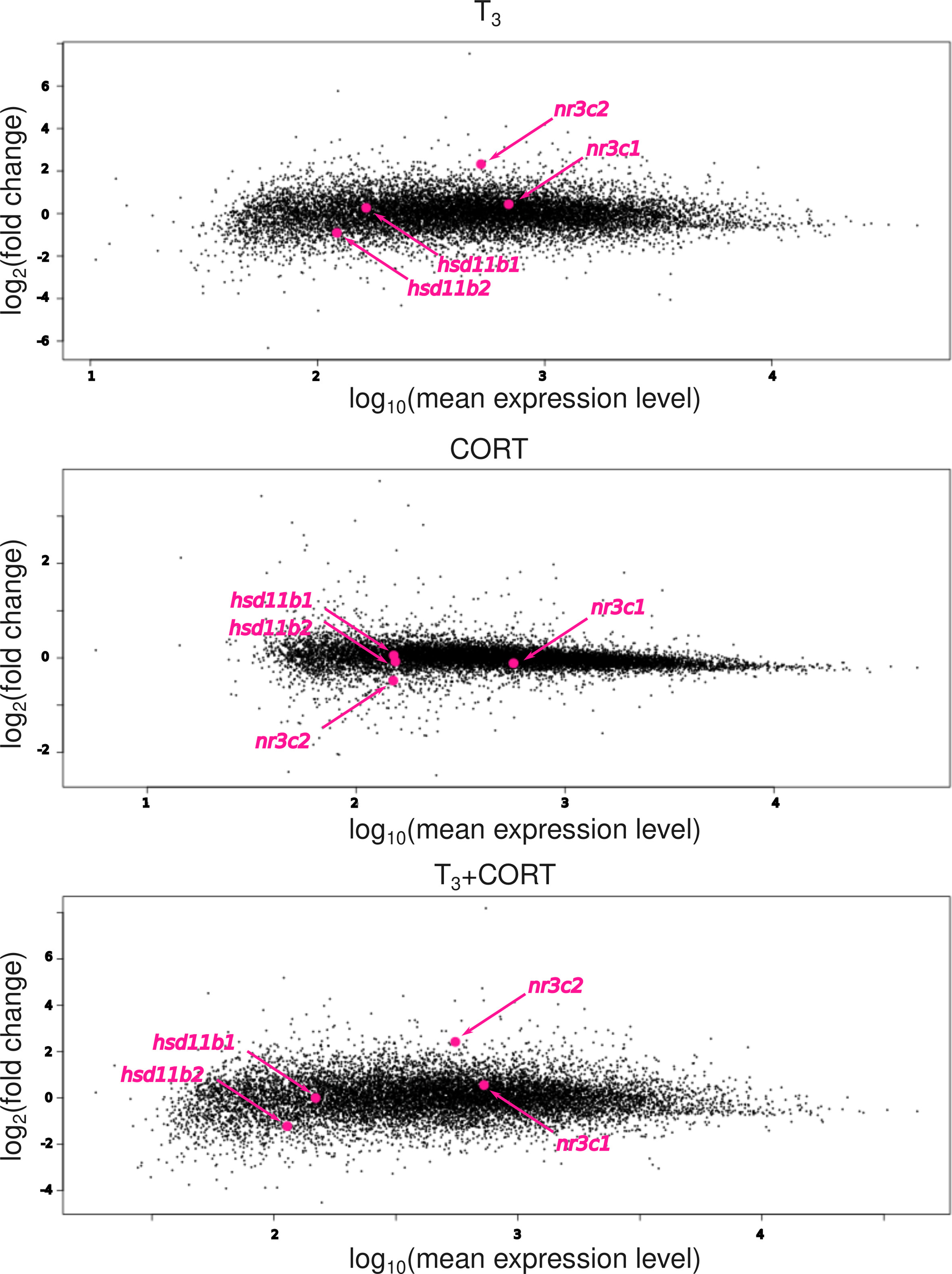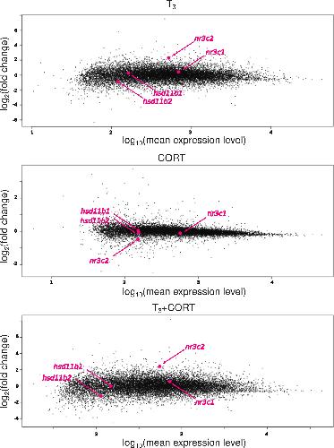 Figure S3. Gene expression level of genes involved in CORT mode of action and CORT bioavailability. The genes coding for the glucocorticoid receptor (nr3c1), the mineralocorticoid receptor (nr3c2), the hydroxysteroid 11-beta dehydrogenase 1 that preferentially convert cortisone to the active CORT (hsd11b1) and the hydroxysteroid 11-beta dehydrogenase 2 that convert CORT to the inactive cortisone (hsd11b2). Each gene is positioned on the MA plots to show their levels of expression and variation following T3 or/and CORT treatment. CTRL = control; T3 = 3,3',5-triiodothyronine; CORT = corticosterone; T3+CORT = 3,3',5-triiodothyronine + corticosterone. |