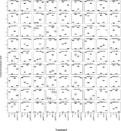 Figure S4. Expression profiles of T3, CORT and T3+CORT differentially expressed genes. Transcriptome analysis reveals 81 expressions profiles. For each gene, the expression level was adjusted to a variance of 1, and normalized by the mean expression level across all four conditions. Within each cluster, expression values are summarized by a box plot. Upper and lower “hinges” correspond to the first and third quartiles. The upper and lower whiskers extend from the hinge to respectively the highest or lowest value that is within 1.5 times the inter-quartile range of the hinge. Data beyond the end of the whiskers are outliers and plotted as points. The number of genes in each cluster is indicated after the cluster number. CTRL = control; T3 = 3,3',5-triiodothyronine; CORT = corticosterone; T3+CORT = 3,3',5-triiodothyronine + corticosterone. |
