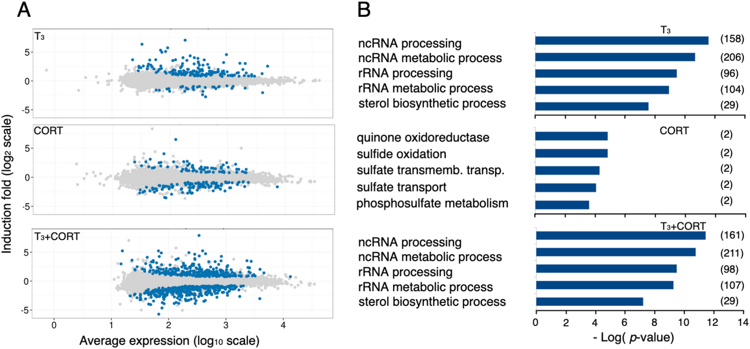 Fig. 2. T3 and CORT affect hindlimb transcriptome. A) Relationship between the mean expression level and the difference of expression measured by RNA-Seq (MA plot). Genes reported as differentially expressed by DESeq (FDR = 0.05) relative to the control are colored in blue. B) The five most significant biological terms or pathologies associated to T3, CORT or T3+CORT differentially expressed genes. The numbers in parentheses correspond to the number of genes for each term. CTRL = control; T3 = 3,3',5-triiodothyronine; CORT = corticosterone; T3+CORT = 3,3',5-triiodothyronine + corticosterone. (For interpretation of the references to color in this figure legend, the reader is referred to the Web version of this article.) |