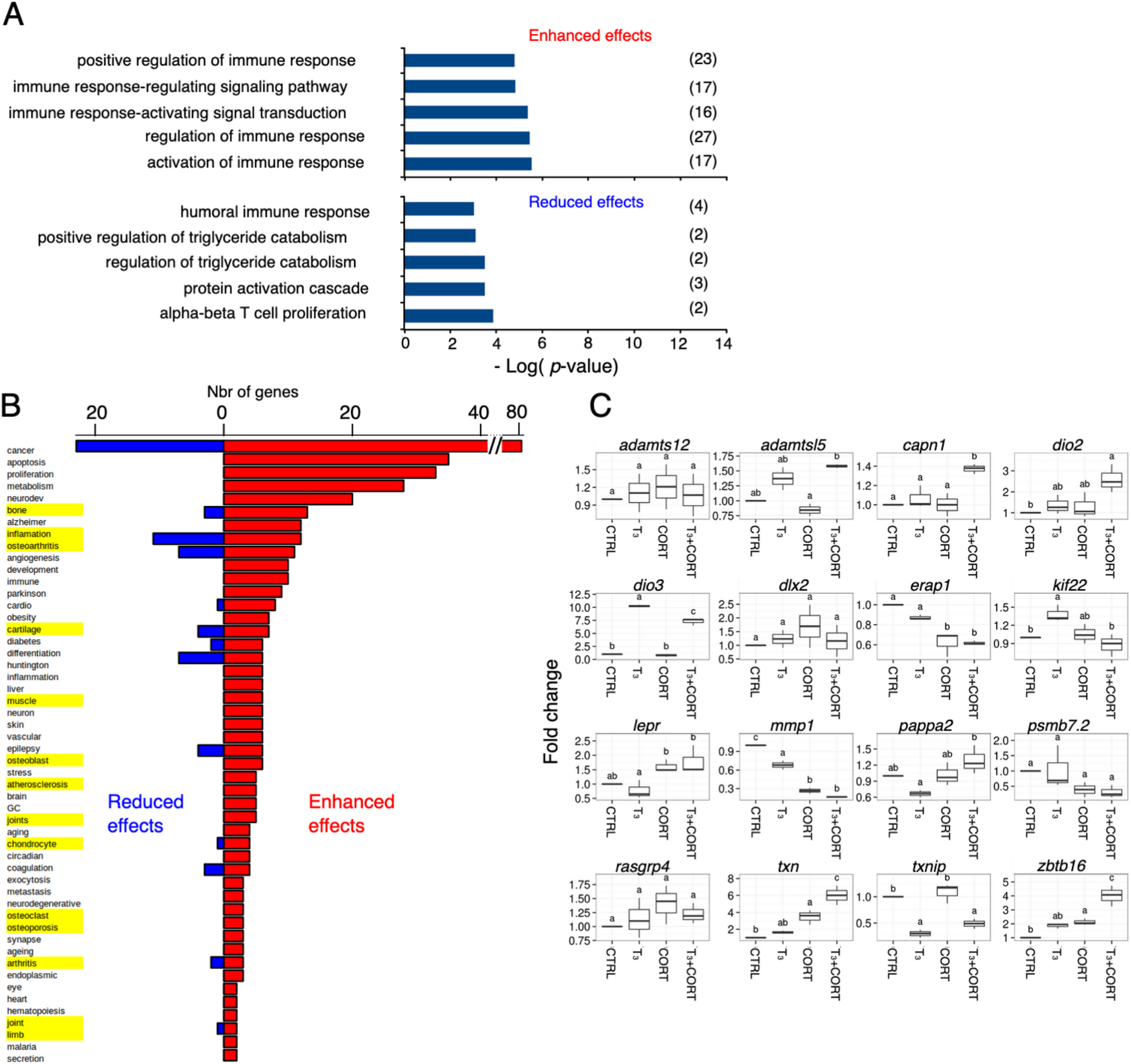 Fig. 4. Genes co-regulated by T3 and CORT are functionally enriched in terms related to skeletal structures. A) The five most significant biological terms or pathologies associated to “enhanced” or “reduced” genes. The numbers in parentheses correspond to the number of genes for each term. B) Manual annotation of biological function associated with enhanced and reduced differentially expressed genes. The histograms represent the number of genes for each term. Terms associated with skeletal biology or pathology are highlighted in yellow. C) RT-qPCR validation of the expression following T3, CORT and T3+CORT treatments of 16 genes involved in skeletal biology. Box plots represent the fold changes (n = 10/treatment condition), and box plots with the same letter are not significantly different (p < 0.05; Mann-Whitney test). CTRL = control; T3 = 3,3',5-triiodothyronine; CORT = corticosterone; T3+CORT = 3,3',5-triiodothyronine + corticosterone. (For interpretation of the references to color in this figure legend, the reader is referred to the Web version of this article.) |